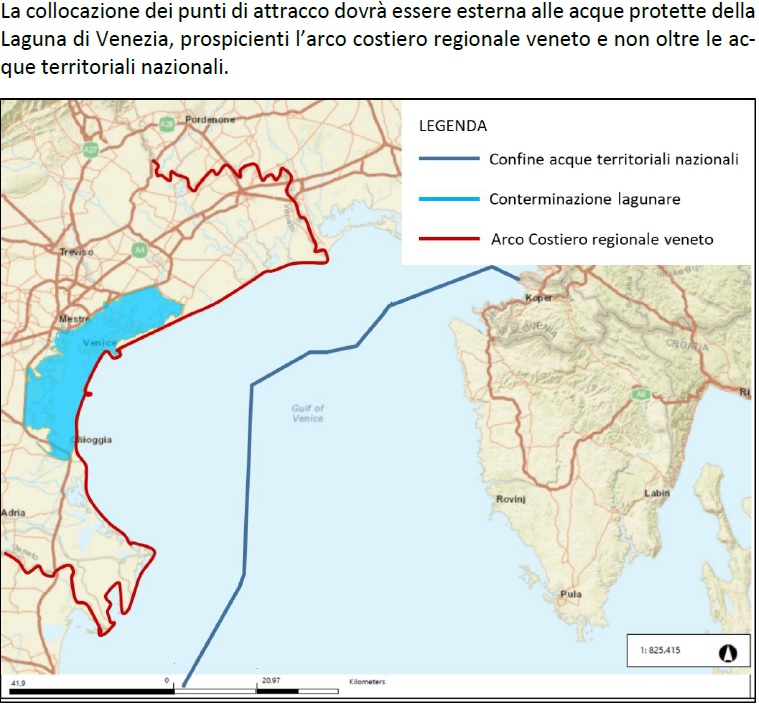 “La collocazione dei punti di attracco – si legge nel bando – dovrà essere esterna alle acque protette della Laguna di Venezia (sulla base della conterminazione decisa nel 1990, ndr), prospicienti l’arco costiero regionale veneto e non oltre le acque territoriali nazionali”. Questi gli obiettivi richiesti ai proponenti: “garantire l’operatività e la sicurezza della navigazione anche in condizioni meteo-marine avverse e garantire la sostenibilità dal punto di vista ambientale, energetico e paesaggistico; prevedere il collegamento ai nodi di interscambio terrestri e alle reti TEN-T; garantire l’accoglienza di servizi transoceanici container (porto Gateway e transhipment) e per la crocieristica (Home Port)”.