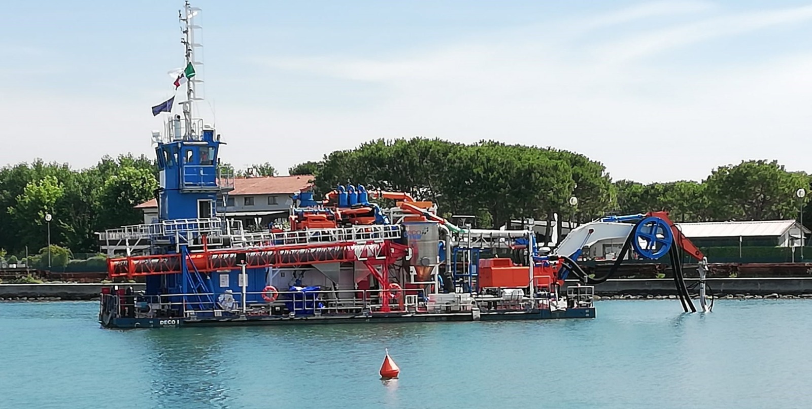 La nuovissima draga DECO1, varata a fine 2020, è una piattaforma modulare di 24 metri per 12 ed è la prima ad entrare in azione; altre due di diverse dimensioni saranno presto realizzate. L’unità DECO1 asporterà i sedimenti senza entrare in contatto con i fondali grazie alla tecnologia LIMPIDH2o Decomar: attraverso la creazione di un campo di depressione intorno allo scavo viene infatti eliminata la fuoriuscita di materiale e la conseguente risospensione dei sedimenti (come invece avviene nel dragaggio tradizionale) evitando così la diffusione degli agenti inquinanti che vi sono presenti.