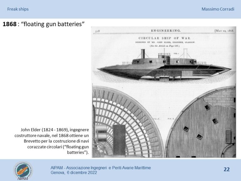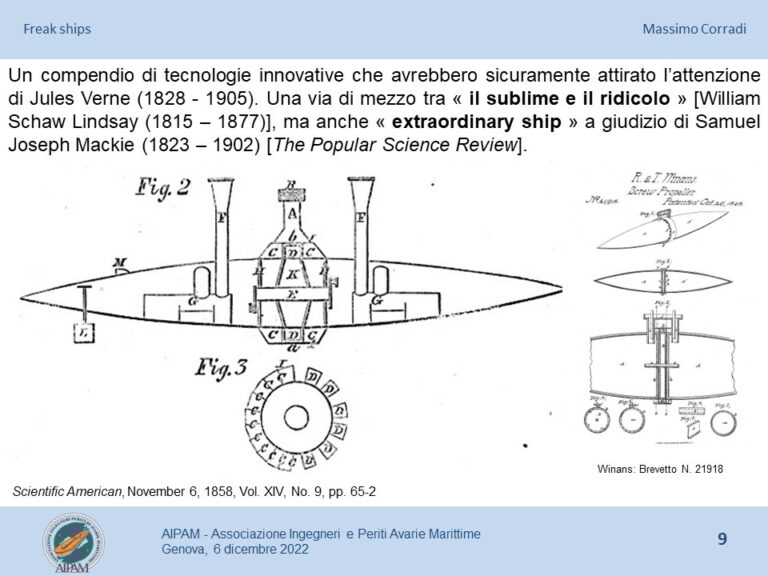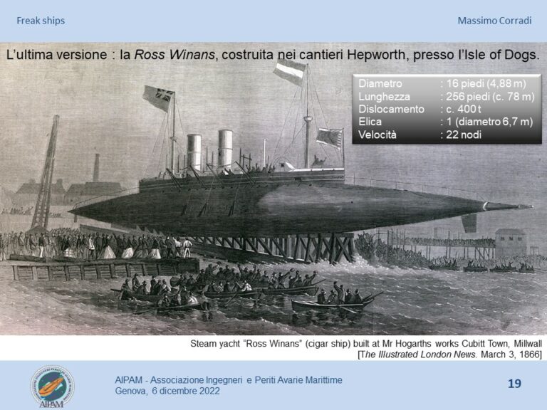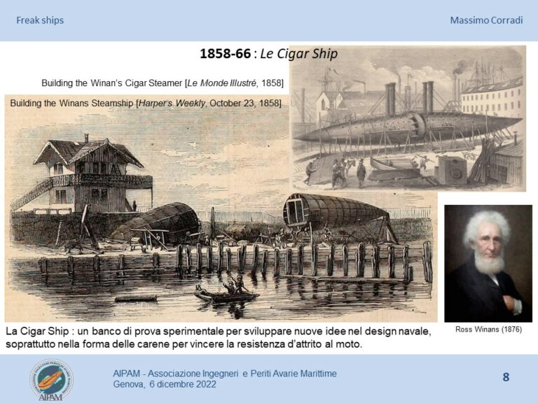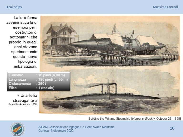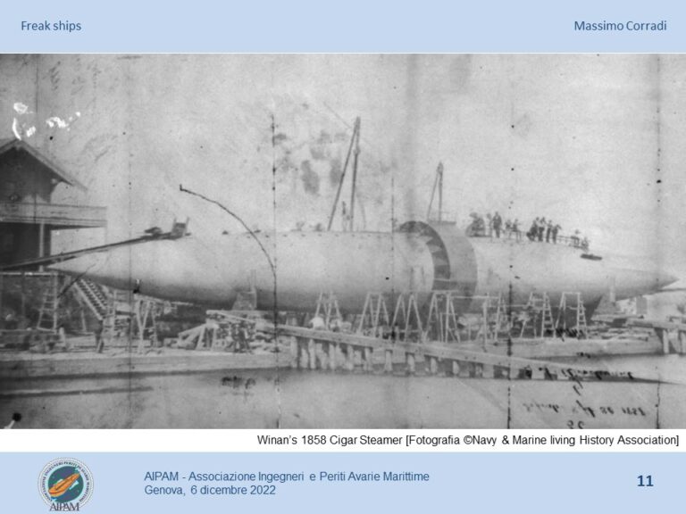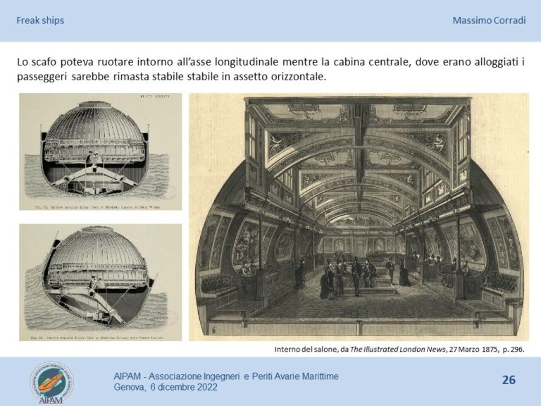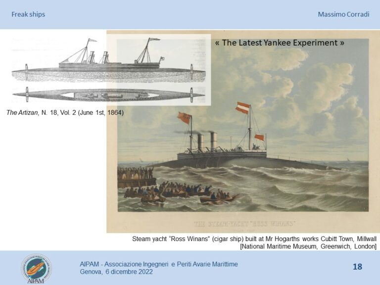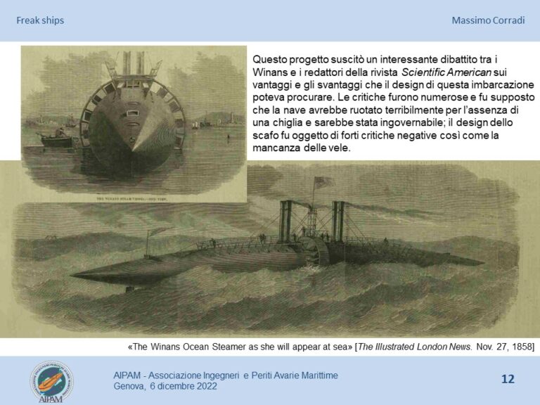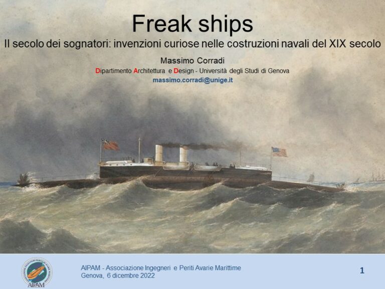 Il compito di intrattenere gli ospiti della serata è stato affidato al prof. Massimo Corradi, architetto e professore associato di Storia delle scienze e delle tecniche presso l’Università di Genova, con una presentazione intitolata “Freak ships – Il secolo dei sognatori: invenzioni curiose nelle costruzioni navali del XIX secolo”.