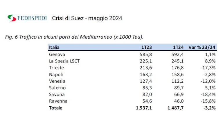 Una delle informazioni più originali e interessanti è quella riguardante i traffici di container movimentati dai maggiori porti italiani dalla quale emerge che Genova (+1,15), La Spezia (+8,9%) e Salerno (+5,1%) nei primi tre mesi del 2024 hanno visto crescere il numero di box imbarcati e sbarcati mentre Trieste (-17,3%), Venezia (-12%) e Ravenna (-15,8%) sembrano aver pagato il prezzo più caro del baricentro delle rotte commerciali Asia – Europa spostatosi dal canale di Suez allo Stretto di Gibilterra. Fra gli altri scali maggiori del paese si registrano poi flessioni anche a Napoli (-2,8%) e a Savona (-18,4%).