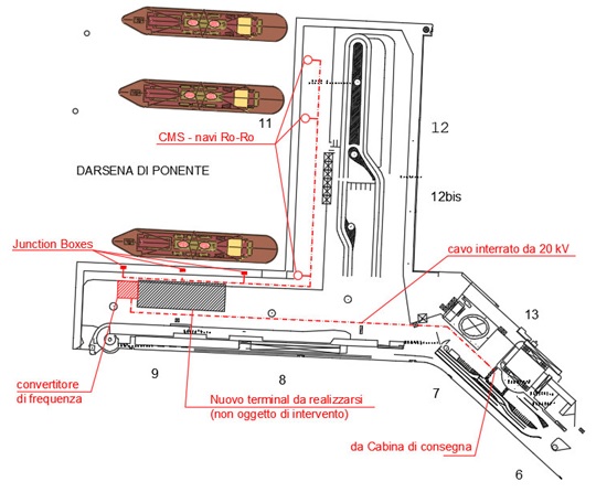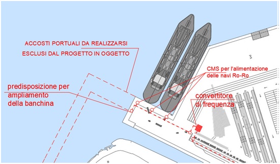 Valutata la frequenza di attracco delle due tipologie di utenze individuate, infatti, si è stabilito di dimensionare l’impianto considerando la contemporaneità di due navi Ro-Ro/Ro-Pax o, in alternativa, di una nave Ro-Ro/Ro-Pax e una nave da crociera, sarà installato, quindi, un convertitore di potenza da 16 MVA con uscite a 6,6/11 kV.