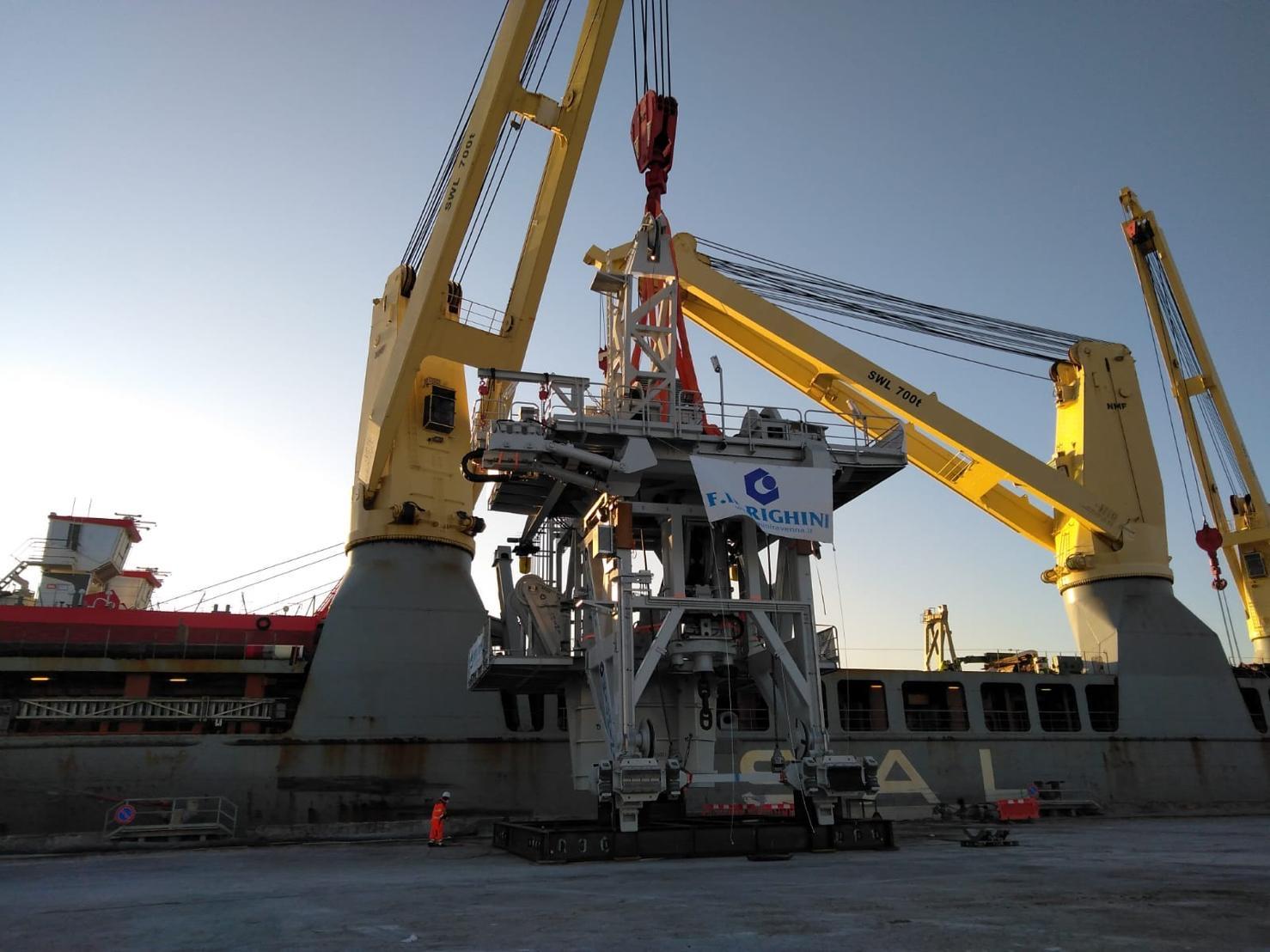 A Marghera, ad esempio, una nave di Sal Heavy Lift ha appena imbarcato un impianto (tecnicamente chiamato Riser Pull In System) realizzato dalla società F.lli Righini su commissione di TechnipFMC UK e destinato a essere installato sulla unità Fpso Energean Power.