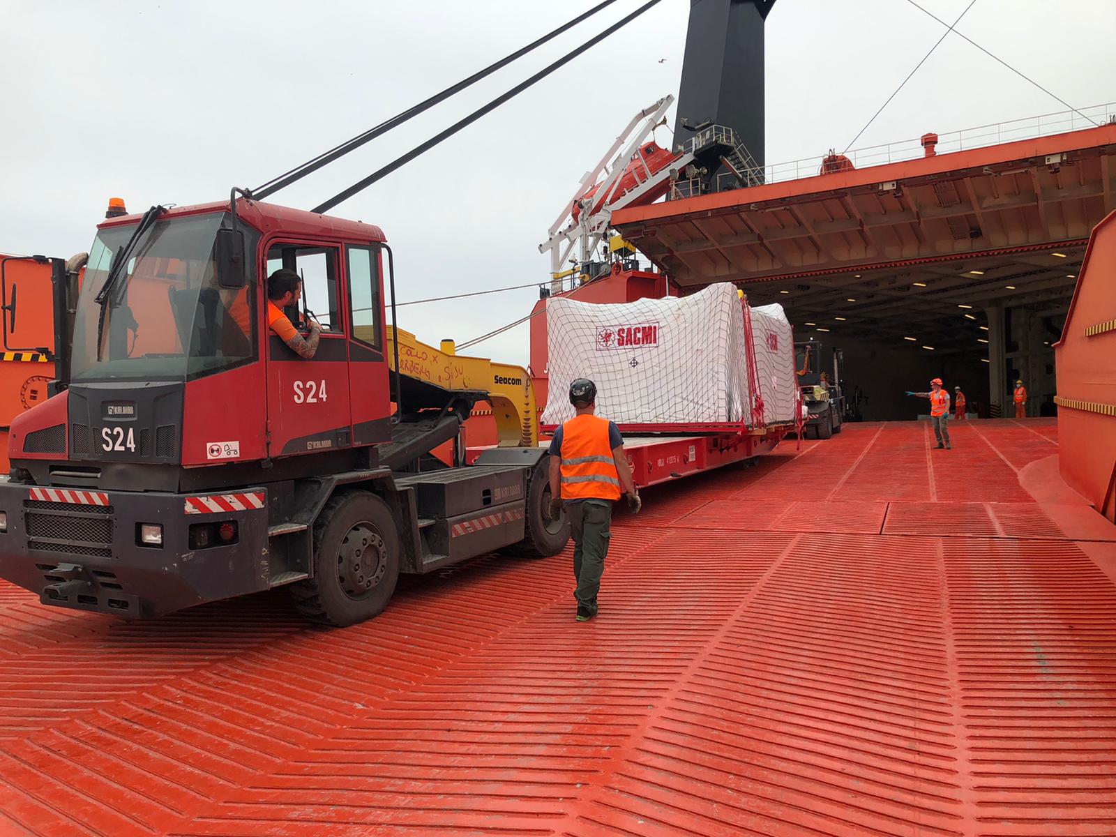 Le operazioni di imbarco si sono svolte lunedì 18 maggio con modalità ro-ro utilizzando carrelli della Compagnia Portuale. L’operazione si giova della collaborazione della società Traghetti & Crociere, che ha messo a disposizione le proprie aree per lo stoccaggio temporaneo dei colli da imbarcare.