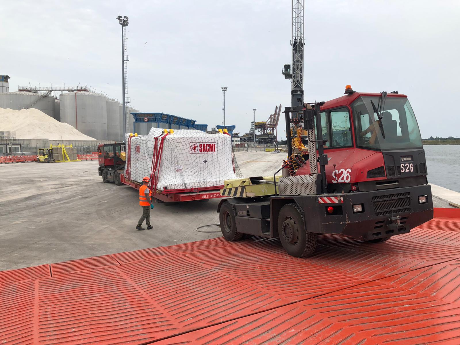 La nave, rappresentata a Ravenna dall’agenzia marittima Italteam Shipping, ha imbarcato con destinazione Iraq un carico eccezionale costituito da 30 sottostazioni elettriche prodotte a Lodi (si tratta di trailer di peso variabile tra le 30 e le 80 tonnellate). E da altri 20 colli, tra cui due presse prodotte dalla Sacmi di Imola da 125 tonnellate di peso ciascuna.