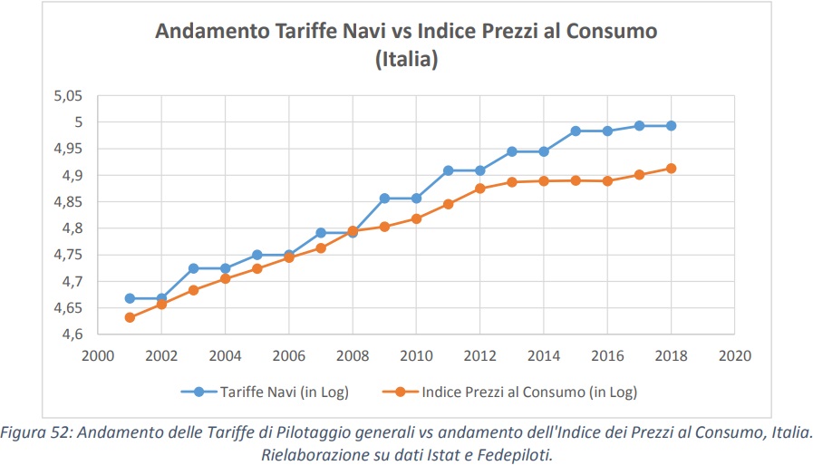 “La tariffa applicata per nave usufruente del servizio di pilotaggio ha avuto più recentemente un trend di crescita superiore rispetto all’andamento dell’indice dei prezzi al consumo, a conferma che mediamente le tariffe applicate dalle corporazioni si posizionano su incrementi maggiori rispetto a quello dell’inflazione, ma pur sempre entro i limiti imposti dal Ministero delle Infrastrutture e dei trasporti.”