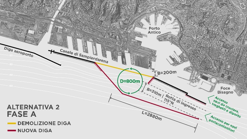 La soluzione n.2 (che corrisponde però alla prima delle tre alternative) le navi dirette a calata Bettolo e agli altri terminal del porto commerciale storico accederebbero dalla nuova imboccatura mentre le unità dirette al Porto Antico e alle banchine di Stazioni Marittime e calata Sanità continuerebbero a navigare il canale attualmente esistente. Il nuovo canale di accesso avrebbe larghezza 310 metri e lunghezza 2.800 metri.