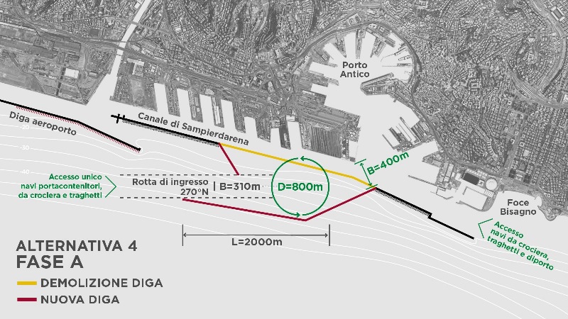 La soluzione alternativa n.4 (la terza in ordine di presentazione) prevede invece che tutte le navi possano accedere da una nuova imboccatura creata a ponente, incluse le navi dirette al porto storico che dovrebbero poi transitare attraverso il varco in prossimità di Terminal Bettolo. In questo scenario il nuovo canale d’accesso avrebbe larghezza pari a 310 metri e lunghezza di 2.000 metri, mentre avamposto davanti a Bettolo (800 metri di diametro) e nuovo canale interno (400 metri) rimarrebbero con le stesse misure.