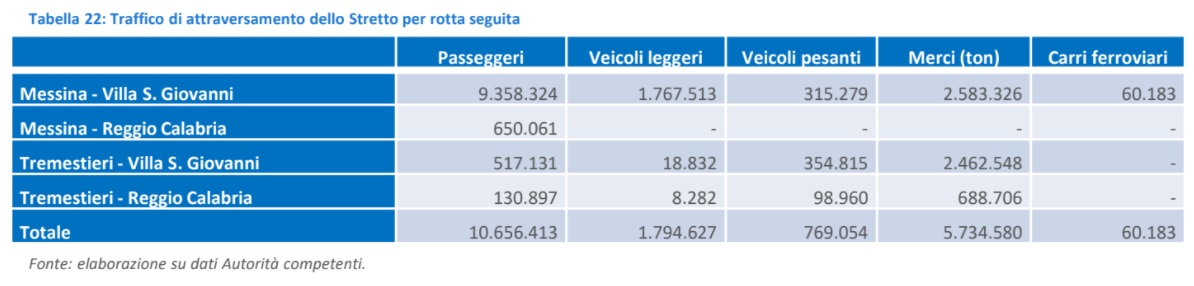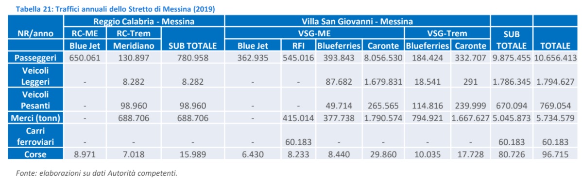 “Complessivamente i servizi oggi offerti con un tempo di navigazione di 20-30 minuti, oltre ai perditempo di accesso, attesa e uscita dai terminali di trasporto nonché di rottura di carico, consentono il transito annuo di oltre 10 milioni di passeggeri, circa 1,8 milioni di automobili, circa 800.000 veicoli merci pesanti (camion), oltre 5 milioni di tonnellate di merci e 60 mila carri ferroviari” si legge nel documento.