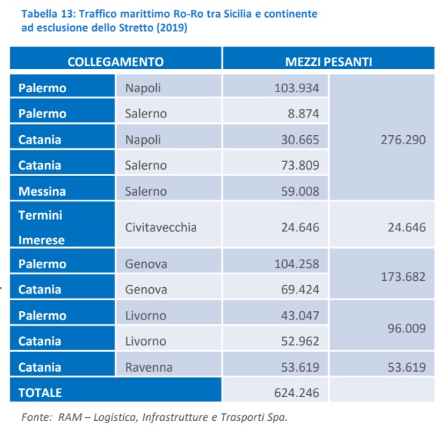 effettuati in modalità Ro-Ro (roll-on/roll-off) per il trasporto di passeggeri, auto, mezzi pesanti e semirimorchi, mostra i seguenti numeri in termini di domanda (trasporto di mezzi pesanti per via marittima, con esclusione dell’attraversamento dello Stretto): “Nel 2019 sono stati trasportati 624.246 mezzi pesanti, in prevalenza verso la Campania (276.290) e la Liguria (173.682). I collegamenti con i porti della Campania costituiscono una quota rilevante (44%) del totale e mostrano quindi che un collegamento stabile attraverso lo Stretto potrebbe servire, almeno in parte, questo segmento di traffico“.