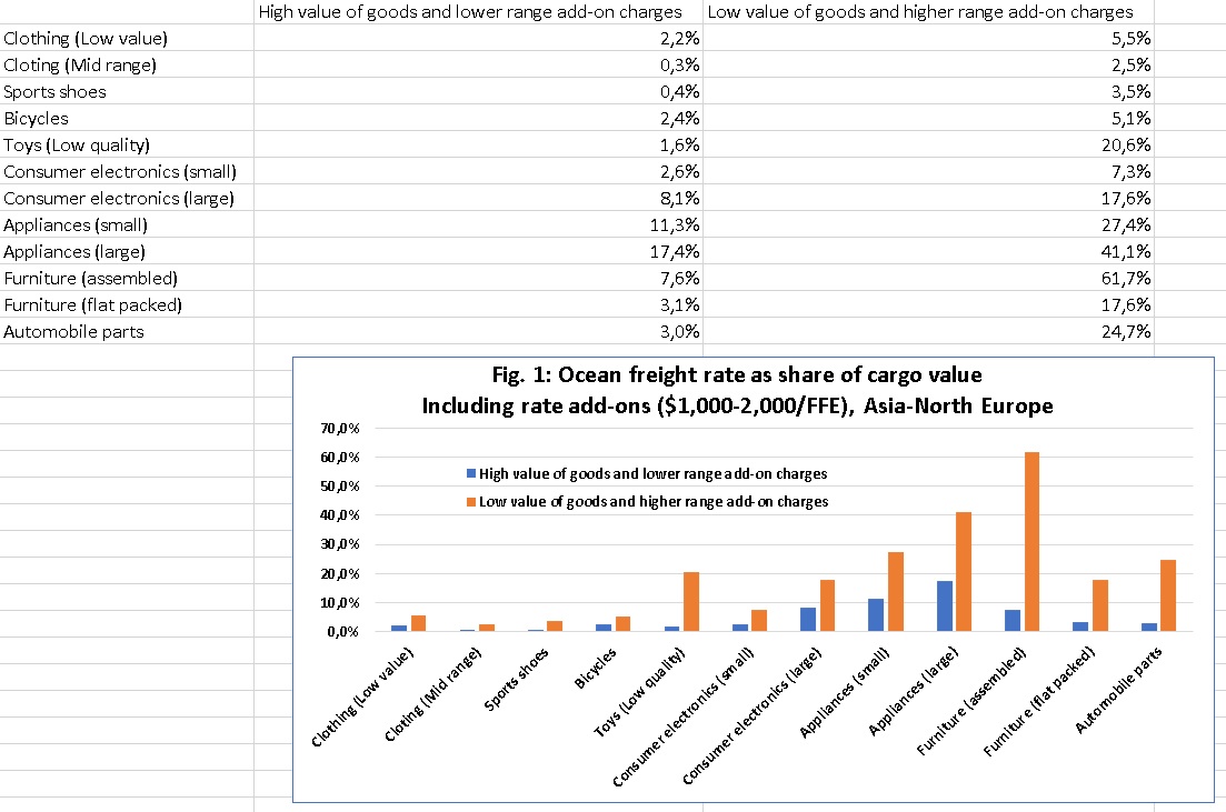 Come mostrano gli istogrammi la categoria di cargo owner più colpita risulta essere quella dei mobili assemblati, dove l’incidenza del nolo marittimo rappresenta fino al 62% del valore al dettaglio della merce trasportata. La condizione attuale si dimostra critica anche per chi deve spedire via mare elettrodomestici: per i grandi prodotti l’incidenza arriva fino al 41% del valore del carico mentre per gli strumenti più piccoli fino al 27% del valore al dettaglio. Costa caro, rispetto al valore della merce (più del 20%), anche il trasporto via mare di merceologie come le parti di ricambio per l’industria automotive e i giocattoli di bassa qualità.
