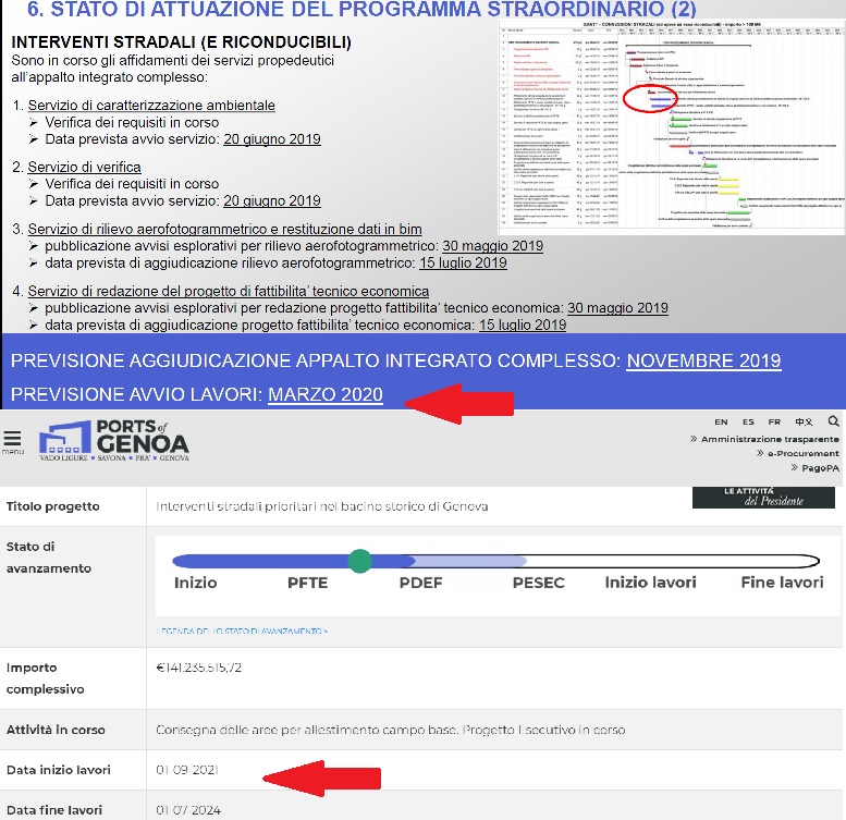Anzi. Dopo il Morandi e il decreto Genova arrivarono altri soldi e l’opera slittò fra quelle a corsia privilegiata, ricompresa nel mega appalto di interventi stradali da 124 milioni di euro. Presentandolo alla Camera nel giugno 2019 (si veda immagine in pagina) l’Autorità presieduta da Paolo Emilio Signorini previde l’aggiudicazione per il novembre 2019 e l’avvio lavori nel marzo 2020: la prima avvenne nel dicembre 2019 (a Pizzarotti), ma ad oggi, con l’appalto lievitato prima a 128 e poi a 141 milioni di euro, non è stato mosso un centimetro di asfalto e l’inizio lavori è slittato di 18 mesi al settembre 2021.