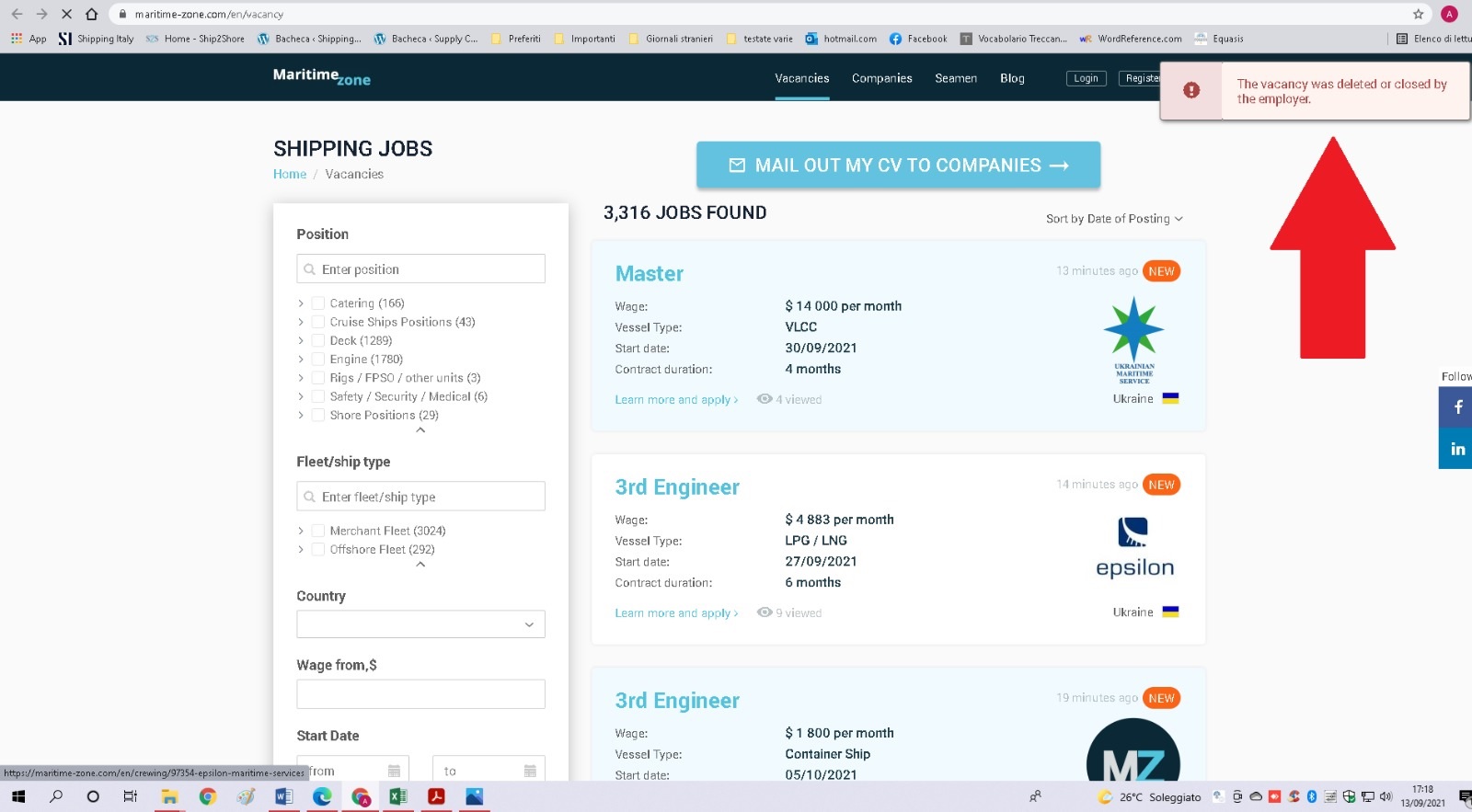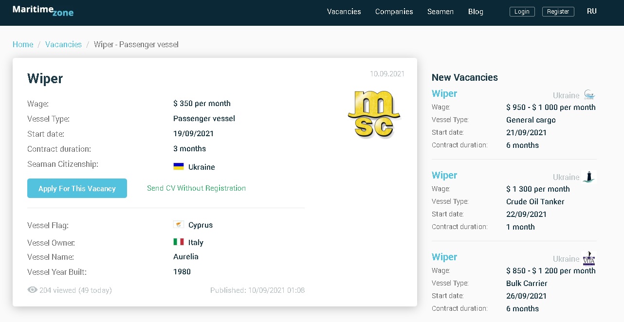 È una nave battente bandiera cipriota, di proprietà di Snav, società controllata da Marinvest, impiegata attualmente nel servizio di quarantena per migranti appaltato dallo Stato alla genovese Grandi Navi Veloci. Snav si occupa dell’hotelerie, ma il manning di macchina e coperta è appannaggio di Msc Cipro, emanazione cipriota del gruppo elvetico di Gianluigi Aponte. L’offerta, riservata a cittadini ucraini, prevedeva, come mostra lo screenshot qui sotto, un imbarco di 3 mesi a 350 dollari al mese, meno di 300 euro.