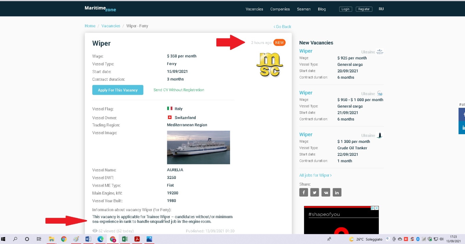 Lo scorso 10 settembre sul sito Maritime Zone – un sito di job placement per marittimi – è apparso un annuncio per un posto di lavoro da “wiper” (una sorta di mozzo della sala macchine, la figura gerarchicamente più in basso del reparto, con funzioni di assistente) sul traghetto Aurelia.