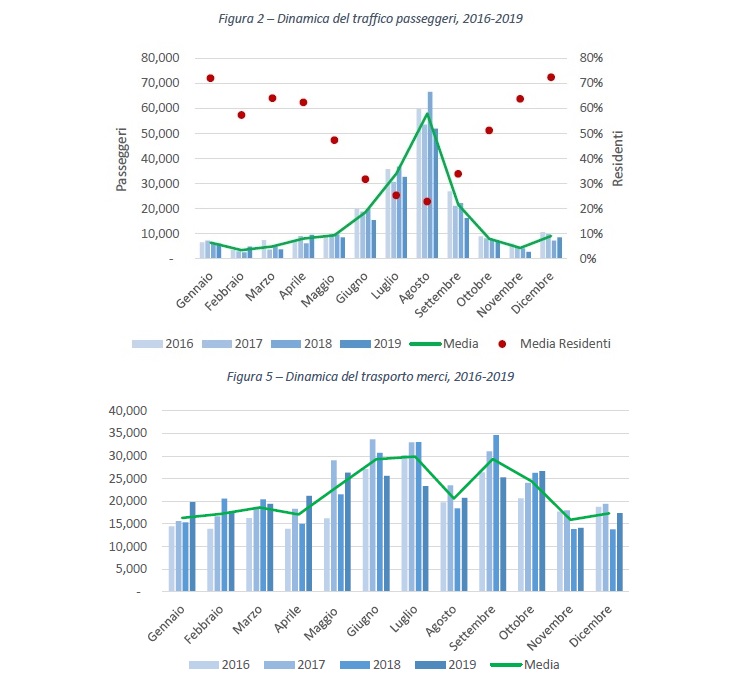 Come si evince dai grafici, il traffico passeggeri è caratterizzato da elevata stagionalità con evidenti picchi nel periodo estivo, mentre il trasporto merci ha un andamento discontinuo nell’anno. Questo il riepilogo: