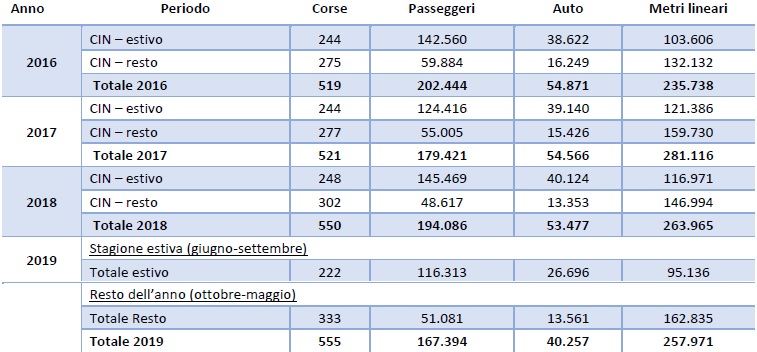 Dall’insieme dei dati (la relazione contiene ulteriori approfondimenti su altri dati, dalle tariffe applicate al load factor) “si evince come la linea Civitavecchia-Cagliari-Arbatax registri una media annua di oltre 185.000 passeggeri, circa 51.000 auto e oltre 250.000 metri lineari di merci. La tratta è fortemente interessata dal traffico stagionale, in quanto si evidenziano picchi di flusso nei mesi estivi e livelli più bassi in quelli invernali; i passeggeri si dividono equamente tra residenti e non (entrambi 50%) e viaggiano prevalentemente in auto. In generale i viaggiatori prediligono la cabina al ponte o alla poltrona e spendono per l’acquisto del biglietto in media 38,4 euro. Chi acquista il biglietto per residenti viaggia in media di più nei mesi invernali, mentre chi acquista il biglietto ordinario viaggia maggiormente nei mesi estivi. Il load factor medio passeggeri per CIN è del 27% e oscilla tra il 35% nella stagione estiva e il 18% nel resto dell’anno”.
