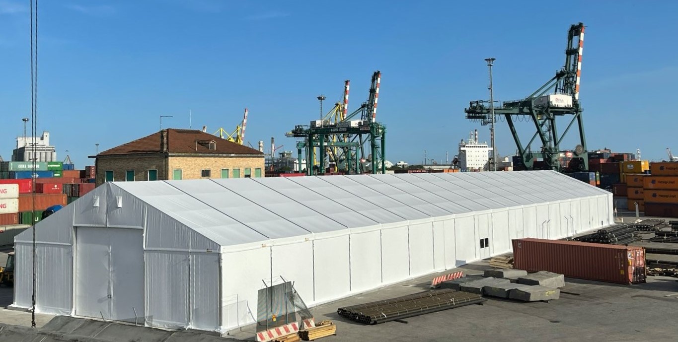Dopo il completamento dei lavori è entrata in funzione una nuova tensostruttura da 2.000 metri quadrati realizzata all’interno degli spazi doganali del terminal container Psa Venice – Vecon di Marghera. Questo spazio consente al terminalista di ampliare il range dei servizi offerti ai clienti del Nord Italia che cercano per le proprie merci spazi coperti e allo stato estero dove stoccare i carichi a seguito di svuotamento dei container.