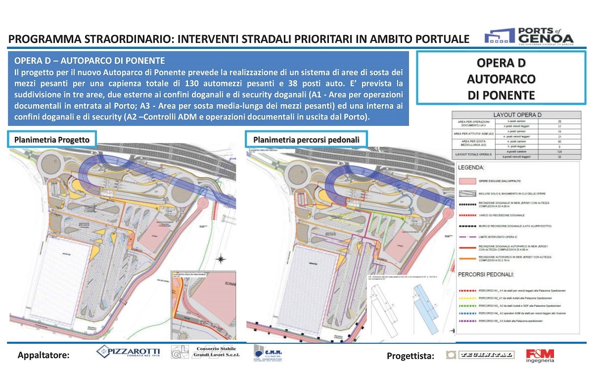 Come ricorda la nota dell’ente, l’appalto ricomprende opere programmate da anni: “Nuovo varco di ponente, il nuovo Ponte del Papa, via Superba, prolungamento sopraelevata esistente, nuovo viadotto di collegamento S. Benigno a calata Bettolo, nuovo varco Etiopia in quota, demolizione e ricostruzione del viadotto Siffredi”. Prevista anche la realizzazione dell’autoparco di ponente, che, stando alla documentazione resa disponibile dalla stessa port authority, parrebbe insistere sull’area cosiddetta Erzelli 2, nel 2020 concessa però (da Società per Cornigliano) per 2 anni (con opzione di rinnovo triennale) al gruppo Spinelli per gestirvi un deposito di vuoti.