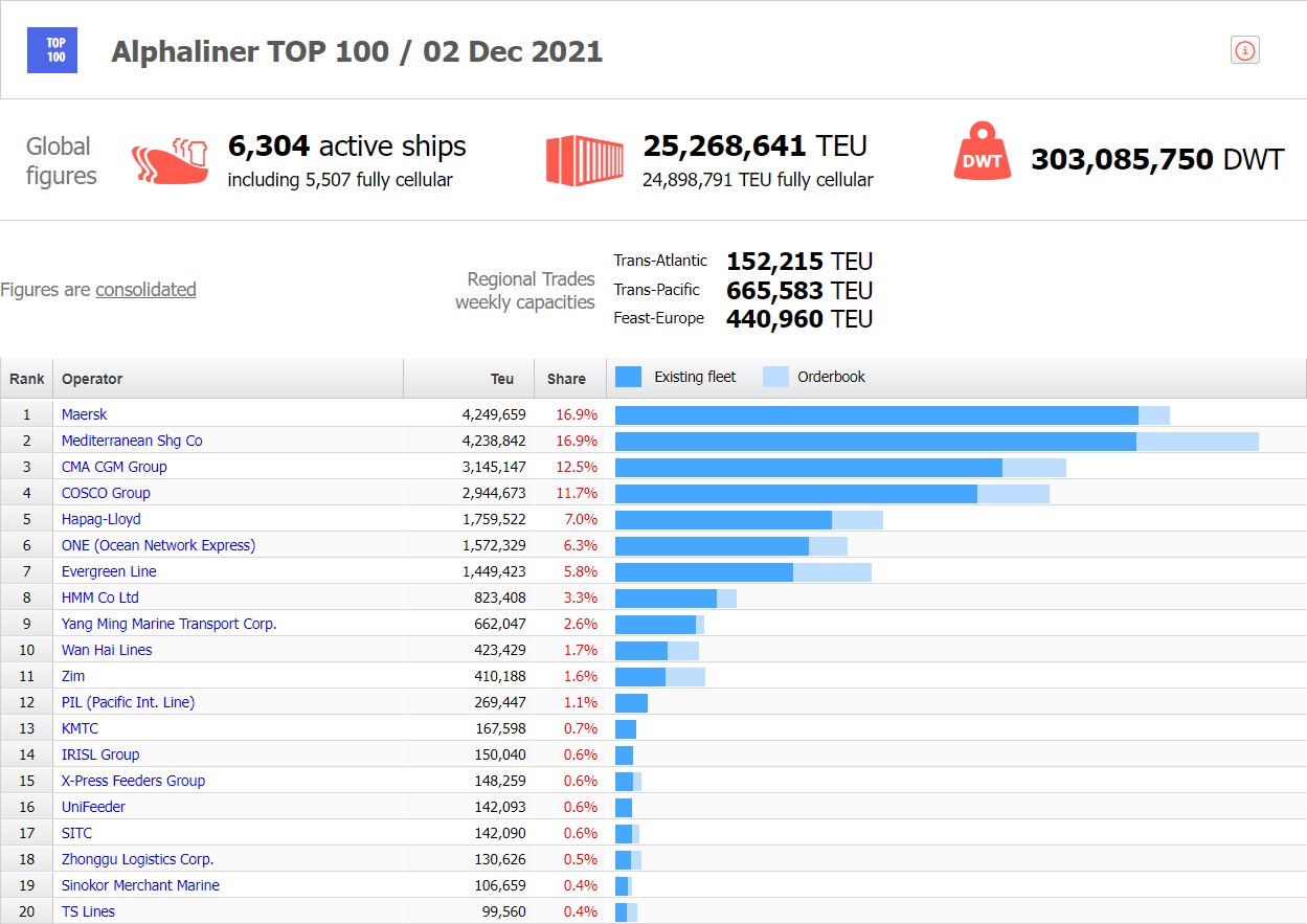 Il cambio al vertice del ranking mondiale per capacità di stiva nel trasporto marittimo di container  è avvenuto o comunque è atteso a brevissimo, a seconda di quali statistiche si voglia considerare. Secondo quanto riportato dal magazine online Splash247 i dati della società di ricerca e analisi Alphaliner mostrano come rimangano appena 10.817 Teu di distanza (tanto quanto una nave post-panamax) fra Msc e la ‘prima della classe’ Maersk affinché lo scettro passi di mano dopo divrsi decenni di dominio danese. Secondo invece Linerlytica, un’altra azienda specializzata nella fornitura di analisi e statistiche sul mercato del trasporto containerizzato di linea, il sorpasso al vertice da parte di Mediterranean Shipping Company sarebbe appena avvenuto. Precisamente, secondo Linerlytica, la shipping company fondata da Gianluigi Aponte avrebbe conquistato il primo posto il 24 novembre quando la nave portacontainer Susan Maersk ha cambiato proprietario diventando Msc Fie.