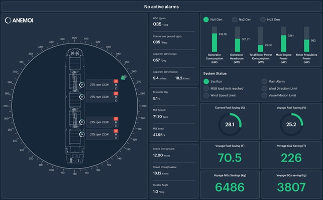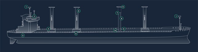- Un pannello di controllo, che offre al capitano il pieno controllo del funzionamento e delle prestazioni della soluzione Norsepower Rotor Sail