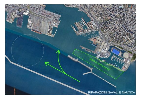 All’estremo levante, per l’area della nautica e delle riparazioni navali, Confindustria suggerisce di sfruttare lo spazio ottenuto con lo spostamento a mare della nuova diga (e teoricamente destinato a suddividere, mantenendo un troncone della diga esistente, le direttrici di traffico fra porto antico e bacino di Sampierdarena) con un’espansione volta ad ottenere nuovi spazi per la navalmeccanica (beneficiaria anche di un ampliamento del bacino n.4) e nuovi accosti per yacht e maxiyacht.