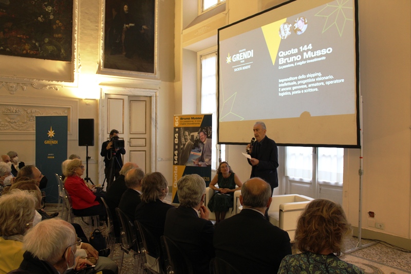 Il titolo della serata era “Quota 144” perchè rappresenta la somma di 84 anni anagrafici e 60 anni di carriera sul ponte di comando dell’azienda nella quale entro nel 1961 raccoglie la storia di un’impresa che ebbe inizio nell’Ottocento con le vicende delle famiglie Grendi e Musso. Oggi è Presidente del Gruppo Grendi, “la più antica casa di spedizioni in Italia che, attraverso i suoi due secoli di attività, riflette una storia di progresso economico che riguarda il nord Italia, Genova e la Sardegna”.