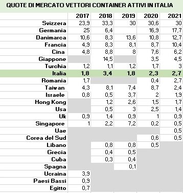 Meno decifrabile la posizione della Germania, che fino al 2017 dominava il mercato italiano con una quota del 25%, per poi crollare al 6,4% nel 2018, sparire dalla rilevazione nel 2019, e farvi ritorno con quote significative nei due anni successivi (rispettivamente 16,9% e 17,7% nel 2020 e 2021). Contando il paese due vettori di notevole importanza come Hapag Lloyd e Hamburg Sud non si può infatti aggiungere molto ai dati senza conoscere come ognuno di essi abbia contribuito a questo andamento.