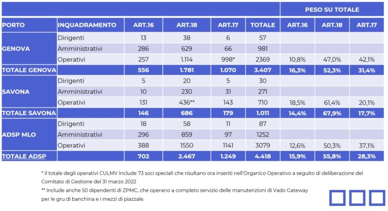 Un duplice focus che consente poi all’Adsp di meglio inquadrare la prevista dinamica occupazionale (lieve aumento degli addetti diretti: fra 2021 e 2023 da 2.337 a 2.418 a Genova, da 782 a 847 a Savona; calo di oltre 20mila avviamenti dell’articolo 17 genovese rispetto al prepandemia) e di provare a farvi fronte.