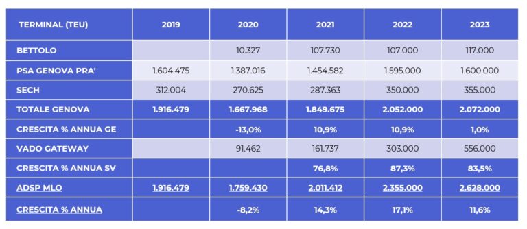 Un’impasse dovuta, come raccontato da SHIPPING ITALY qualche mese fa, appunto al delta fra le risultanze raccolte tra gli operatori e le aspettative dell’Adsp, puntello queste ultime dell’enfasi messa dall’ente sullo sviluppo infrastrutturale dello scalo a suon di investimenti pubblici. Come mostra la tabella di seguito, infatti, il gruppo Psa (la cui trattativa riguardante il servizio Far East Md2 è evidentemente ancora non conclusa) prevede che il suo terminal principale (Genova Pra’) non tornerà ai livelli prepandemici neppure nel 2023 e che quello minore (Sech) non andrà oltre i 355mila Teu, così come Bettolo (Msc), evidentemente poco fiduciosa di ottenere l’autorizzazione ad operare navi maggiori, scommette su una crescita di soli 10mila Teu rispetto ad oggi.