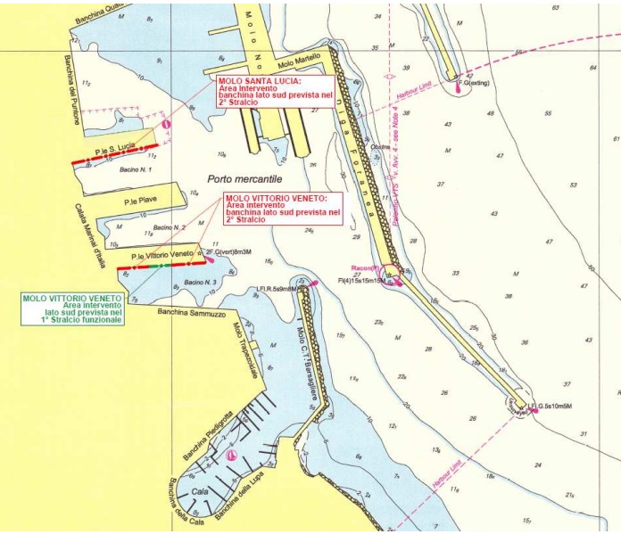 “Il progetto di riqualifica delle banchine Santa lucia lato Sud e Vittorio Veneto lato Sud – si legge nella relazione tecnica predisposta da Adsp – prevede l’adeguamento strutturale delle stesse con una tipologia costruttiva composta da una parete combinata lato mare e da retrostanti pali realizzati ad interasse, dall’asse della parete combinata, pari a 11,00m. Con i lavori del 1° stralcio è stato messo a punto il progetto esecutivo dell’adeguamento strutturale della banchina Vittorio Veneto in corrispondenza della stazione marittima per un tratto lungo 93,60m. Per rendere operativa la banchina lato sud del molo Vittorio Veneto e del molo Santa Lucia l’Autorità di Sistema ha predisposto il progetto del 2° stralcio riguardante la banchina sud del molo Santa Lucia e il completamento della banchina sud del molo Vittorio Veneto”.