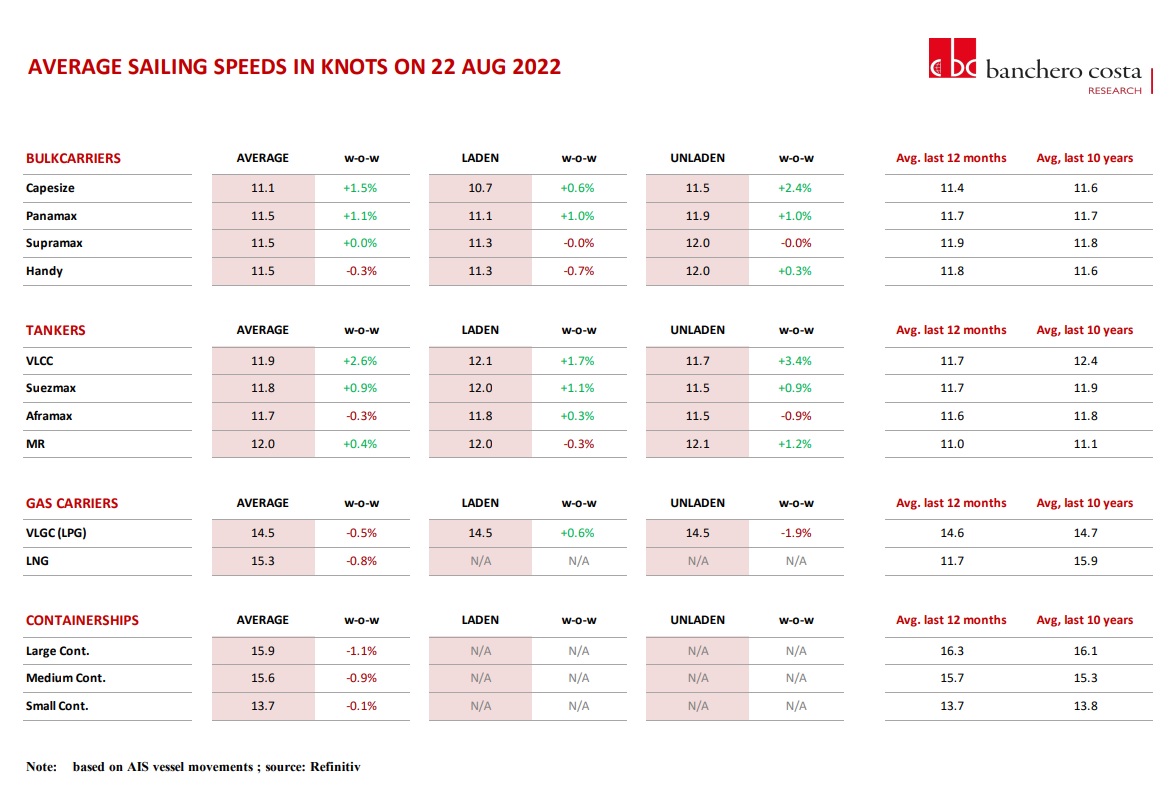A dispetto dell’andamento più alto o più basso dei noli marittimi, dei consumi e del caro-energia, le navi mercantili nell’ultimo anno e nell’ultimo decennio sembrano andare sempre a una velocità simile. Unico caso particolare è rappresentato dalle gasiere che hanno fatto registrare una netta accelerata a riprova di quanto urgenti in questo momento storico siano le forniture dopo lo scoppio della guerra in Ucraina e la chiusura dei rubinetti verso l’Europa da parte della Russia.