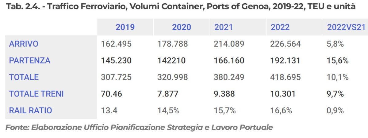 In controtendenza rispetto all’andamento generale del sistema il traffico ferroviario, come mostra la relativa tabella elaborata dall’Adsp, in cui spicca il superamento nel 2022 dei 10mila treni effettuati.