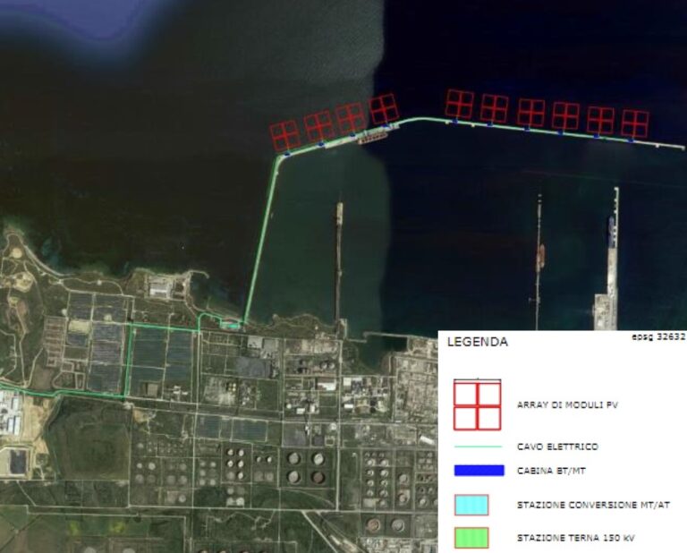 Il progetto in Nord Sardegna prevede di installare 30 ettari di pannelli solari fuori dalla diga foranea dello scalo. A sud proposto insediamento per l’eolico offshore