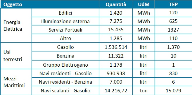 Il Documento di Pianificazione Energetica e Ambientale del Sistema Portuale è stato appena aggiornato dall’ente e per l’anno 2021 ha stimato un consumo di energia elettrica totale pari a 25.415 MWh così suddiviso: 1.565 MWh di consumi elettrici propri di AdSP MI; 23.850 MWh di consumi elettrici per i concessionari. (…) Per completare il censimento del fabbisogno energetico sono stati considerati anche i consumi di combustibile fossile per usi terrestri (gasolio, benzina, ecc..) ed i consumi energetici delle navi residenti e delle navi scalanti. Tutti i dati sono stati uniformati in Tep e di seguito riepilogati al fine di operare con vettori energetici differenti e stabilire quale di essi contribuisca maggiormente in termini di energia primaria del Porto di Taranto”. Si nota come il maggior contributo in termini di consumi energetici sia dato dai mezzi marittimi, che contribuiscono ai consumi con una percentuale superiore all’80%.