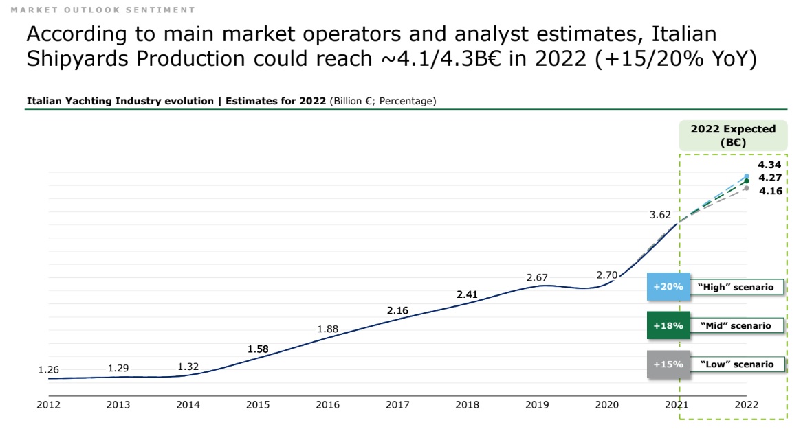 Secondo un’indagine di mercato condotta da Deloitte fra i cantieri associati a Confindustria Nautica, il segmento entrobordo registrerà i tassi di crescita più elevati nel breve termine, mentre le imbarcazioni tra 24 e 45 metri dovrebbero guidare il mercato in termini di crescita futura, seguite dalle unità da 12 a 18 metri. A livello geografico si prevede che Europa e Nord America guideranno la crescita nel 2022 e nel 2023 mentre, il Nord America poi registrerà una crescita più intensa nel lungo termine.