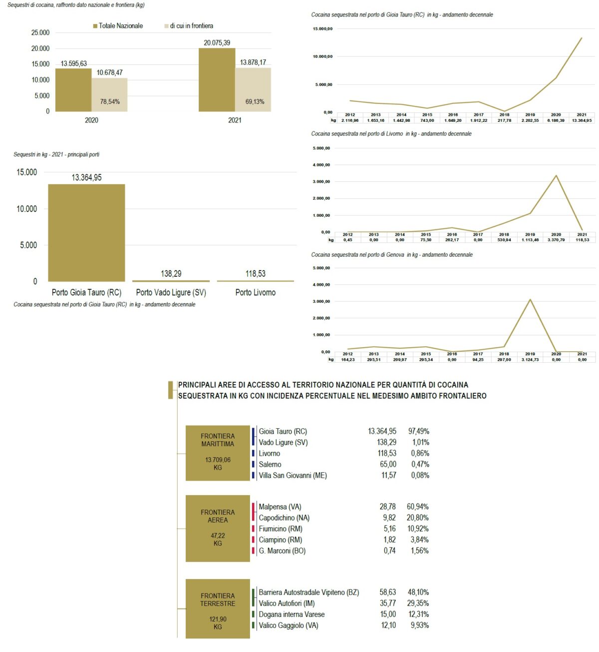 “I maggiori sequestri di cocaina, registrati negli scorsi anni nei porti di Genova e Livorno, oltre che in quello di Gioia Tauro (RC), indicano che le organizzazioni criminali, dopo aver ritenuto per anni il porto calabrese la porta preferita per l’ingresso della cocaina dal Sud America, hanno interessato, negli ultimi tempi, anche altri scali portuali del Mediterraneo, nell’ottica di diminuire il rischio di sequestro, e favorire, in alcuni casi, gli interessi delle cosche locali (…). Nel porto di Gioia Tauro, comunque, nel 2021 sono state sequestrate oltre 13 tonnellate di cocaina, a conferma del ruolo fondamentale e primario, che tale scalo continua a rivestire”.