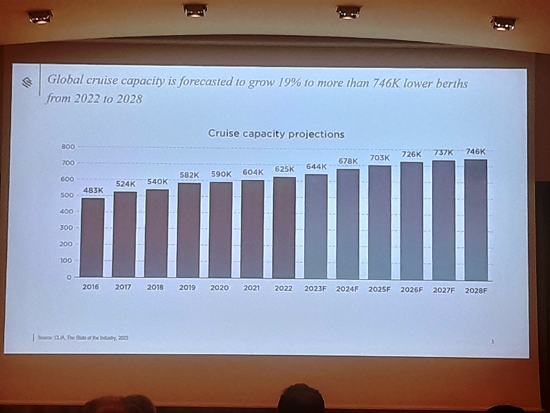 Le previsioni per i prossimi anni parlano di numeri in crescita almeno fino al 2028: la capacità delle navi a livello mondiale salirà progressivamente dai circa 644 mila attuali fino a 746 mila posti letto