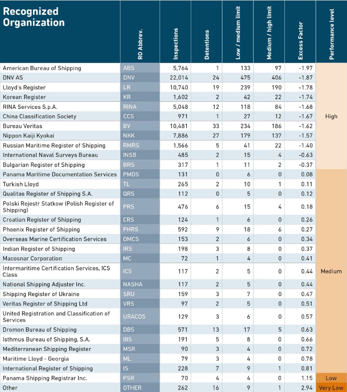 Quanti ai Registri il Comitato ha monitorato attentamente le prestazioni delle Organizzazioni riconosciute (RO), che agiscono per conto degli Stati di bandiera. Per calcolare le prestazioni delle RO, viene utilizzata la stessa formula per calcolare il ‘fattore di eccesso’ degli Stati di bandiera. È necessario un numero minimo di 60 ispezioni per RO prima che le prestazioni vengano prese in considerazione per l’elenco. Nel 2022 sono stati registrati 32 RO nell’elenco delle prestazioni. Rispetto all’anno scorso, il livello di performance delle RO è simile a quello dell’anno precedente, con una sola RO con performance “bassa”. Il Rina è saldamente fra i registri con alte performance, al quinto posto.