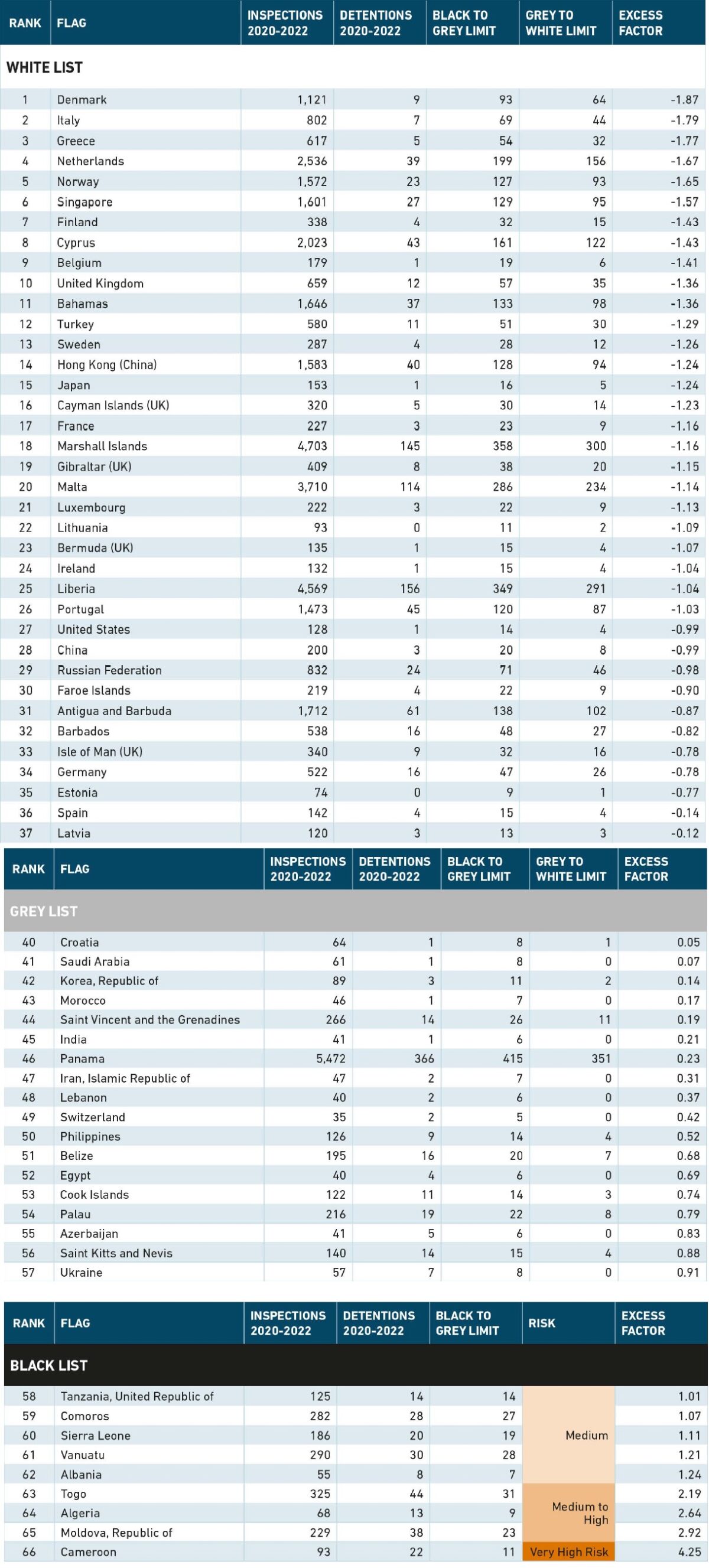 La lista suddivide le bandiere fra bianche, grigie e nere, dalle performance migliori a quelle peggiori sulla base di un indice ricavato dal database di ispezioni, tenendo conto dell’ultimo triennio e di un numero di almeno trenta ispezioni. La classifica 2022 annovera 39 bandiere bianche (quella italiana è al secondo posto per performance, dietro la danese), 18 grigie e 9 nere.