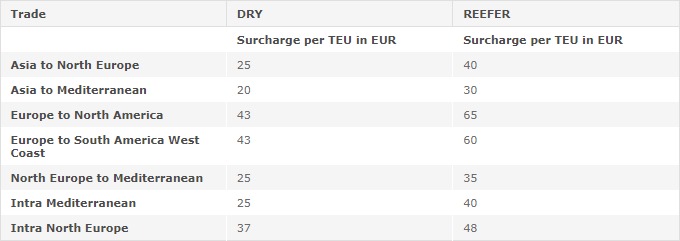 A titolo di esempio, Cma Cgm ha reso noto che il sovrapprezzo per la spedizione di un container da 20′ per carichi secchi dall’Asia al Nord Europa dovrebbe attestarsi a 25 euro, mentre per la spedizione di un container Teu reefer sulla stessa rotta dovrebbe essere pari a 40 euro; la spesa invece per la spedizione dall’Asia al Mediterraneo di un dry box sarà di 20 euro e di un reefer di 30 euro. i valori massimi si notano nella spedizione di un container Teu reefer dal Nord Europa al Nord America dove il surcharge è stiamto in 65 dollari.