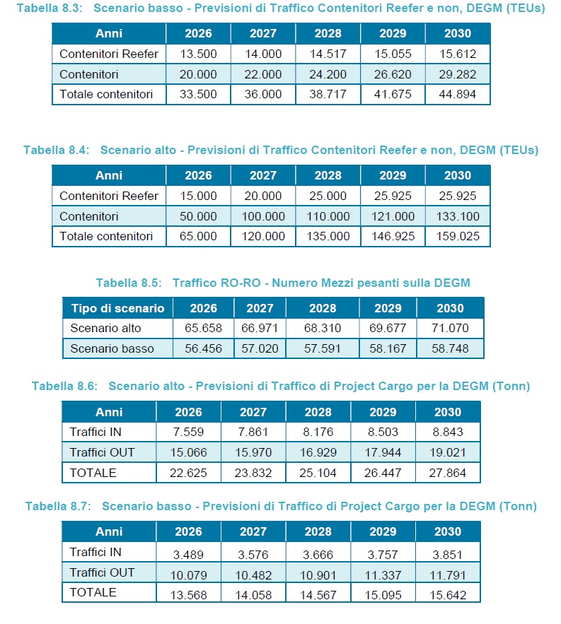 Previsto inoltre un terminal multipurpose, “con una potenzialità complessiva stimata in 3,3 milioni di tonnellate che sarà compito del terminalista arrivare a saturare con il mix di tipologie di traffico più adeguato” (nel 2022 l’intero porto di Civitavecchia ha movimentato 10,2 milioni di tonnellate). Qui si prevedeva lo sviluppo di traffico container, ro-ro e project cargo con le seguenti dinamiche, sempre in due scenari (a fine 2022 i traffici di queste merceologie assommavano a Civitavecchia a 112.000 Teu, 240mila mezzi pesanti e 230mila tonnellate circa di merce solida varia non meglio identificata, in cui rientrano eventuali carichi fuori sagoma).