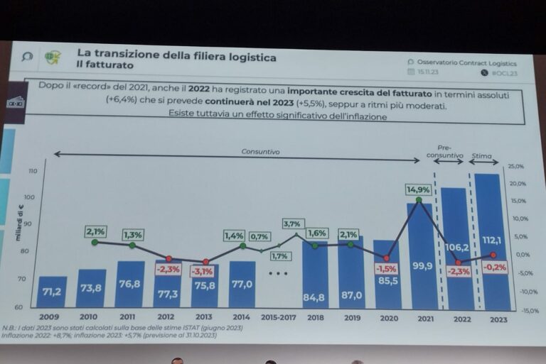 Negli ultimi anni il settore della logistica ha dovuto affrontare continue sfide, dall’aumento dei costi di produzione e del denaro, alla cronica mancanza di personale. In questo contesto, dopo aver raggiunto circa 100 miliardi di euro nel 2021 (+16,8%) e 106 miliardi del 2022 (+6,4%), nel 2023 il fatturato della contract logistics in Italia continuerà la sua crescita, raggiungendo 112 miliardi di euro, a un ritmo più moderato degli scorsi anni (+5,5%). Analizzando i dati 2021 (ultimo anno con dati disponibili a consuntivo), la terziarizzazione raggiunge il 45,3% del valore delle attività logistiche in Italia (135,4 miliardi di euro), a fronte di un valore del mercato della logistica conto terzi (cioè il fatturato diretto ai soli clienti) pari a 61,3 miliardi di euro, +20,8%.