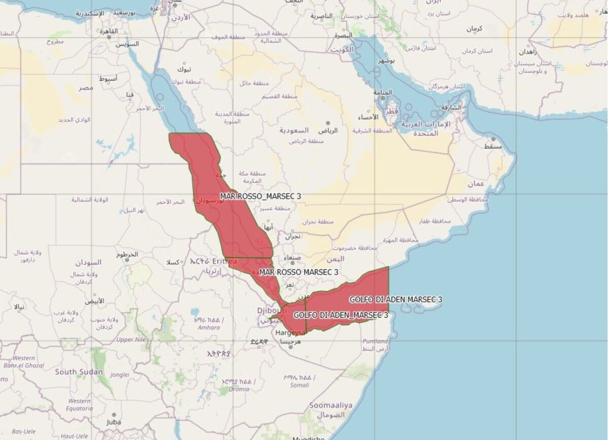 Dal canto suo l’Italia, con l’Imrcc (Italian Maritime Rescue Coordination Center) facente capo al Comando Generale del Corpo delle Capitaneria di Porto, ha disposto l’innalzamento al livello di sicurezza Marsec 3 per le navi in navigazione nell’area del Mar Rosso, stretto di Bab al Mandab, Yemen e Golfo di Aden, come da cartina che pubblichiamo in pagina.