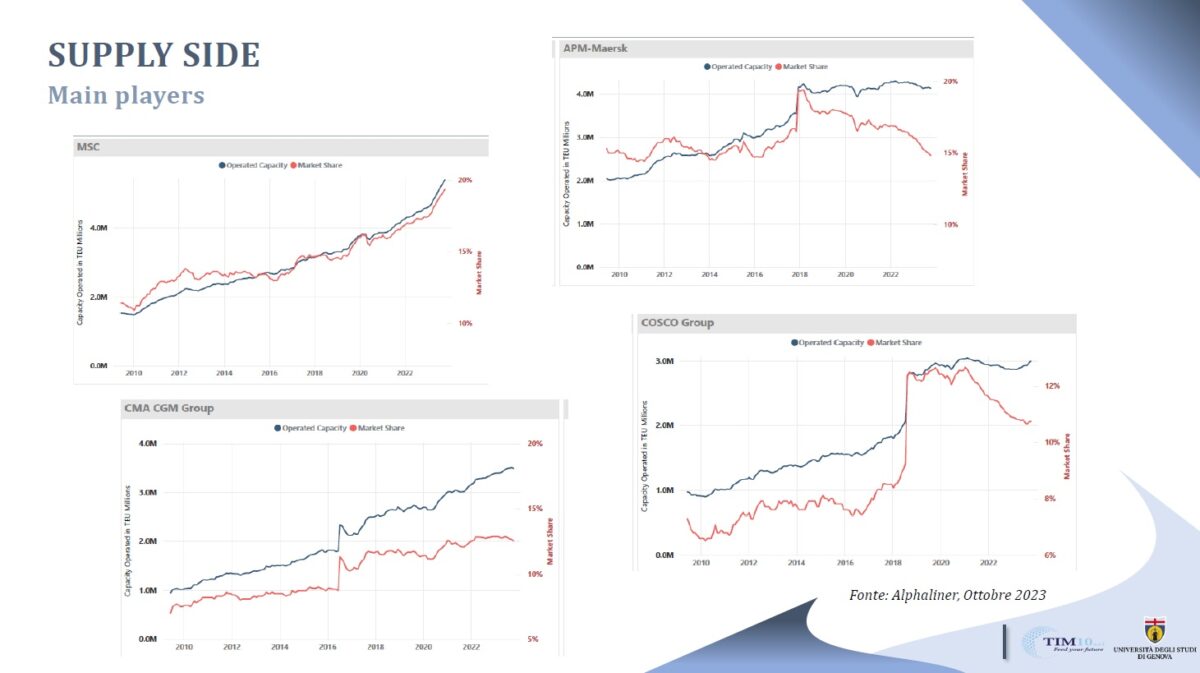 Confrontando infatti il peso relativo delle flotte dei principali player rispetto alla capacità complessiva del settore con la relativa quota di mercato si evidenzia nel tempo un crescente divario tra i due valori per molti di questi: in controtendenza MSC che nel corso dell’ultimo triennio ha visto una crescita della quota di mercato in linea rispetto al peso relativo della capacità della flotta.
