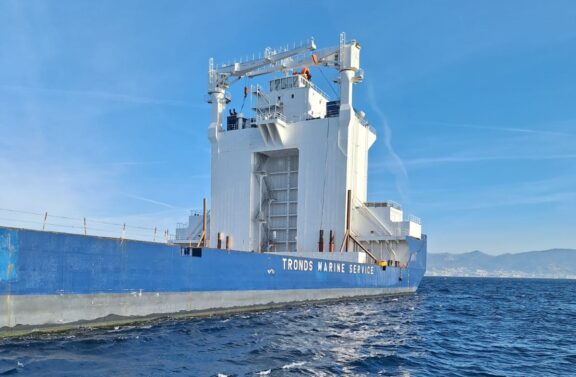 Tronds Barge 33 è attualmente in rada e, dice Webuild, ormeggerà sulla diga di Pra’ prima di entrare in servizio da settembre a Vado Ligure per costruire i cassoni più grandi