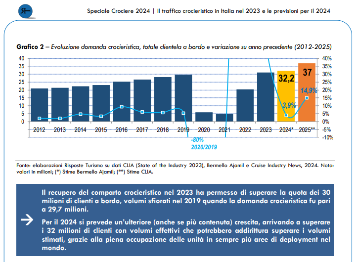 A livello mondiale il recupero del comparto crocieristico nel 2023 ha permesso di superare (secondo le statistiche di Clia) la quota dei 30 milioni di clienti a bordo, volumi sfiorati nel 2019 quando la domanda crocieristica fu pari a 29,7 milioni. Per il 2024 si prevede un’ulteriore (anche se più contenuta) crescita, arrivando a superare i 32 milioni di clienti con volumi effettivi che potrebbero addirittura superare i volumi