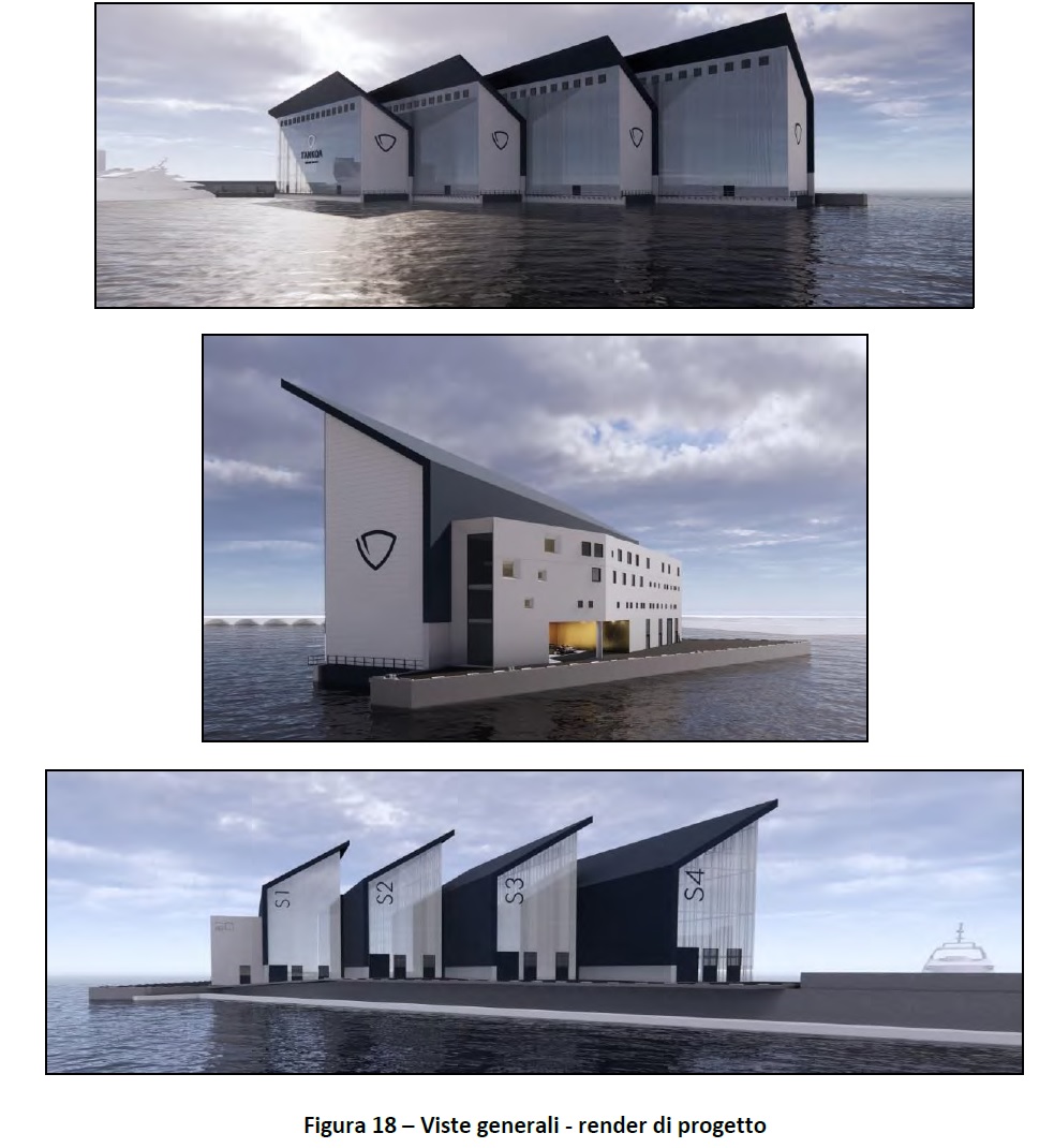 La documentazione pubblicata dal cantiere specializzato nella realizzazione di yacht sopra i 45 metri spiega che l’attuale configurazione del cantiere, dotato di due capannoni di cemento armato di 90 x 18 metri e di un bacino galleggiante per l’alaggio e il varo di yacht fino a 100 metri non consente di allestire più di tre barche contemporaneamente. Ma “l’acquisizione da parte della società di nuove importanti commesse rende necessario ampliare gli attuali spazi dedicati all’allestimento, passando ad una nuova produzione di 5-6 imbarcazioni in simultanea”.