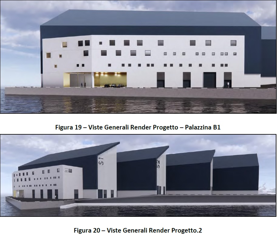 Alti tutti 8 metri fuori dall’acqua (oltre copertura in carpenteria metallica rivestita di policarbonato), i quattro bacini avrebbero le altre dimensioni differenti (82 x 18, 76 x 16,6, 70 x 16,6, 64 x 15,6), mentre per la palazzina è prevista “una pianta rettangolare allungata di dimensioni 66 x 12 metri e un’altezza di circa 15 metri”. Lo studio depositato al Mase spiega che “dato che la funzione dei bacini è solamente per l’allestimento navi, gli scafi nudi in acciaio giungono in cantiere, vengono spostati all’interno del bacino, opportunamente taccati e allestiti completamente. Una volta completato l’allestimento verranno direttamente varati allagando il locale, ossia aprendo il portone in facciata. La facciata verrà completamente chiusa attraverso l’utilizzo di un portone ad impacchettamento collegato alla sovrastruttura di copertura”.