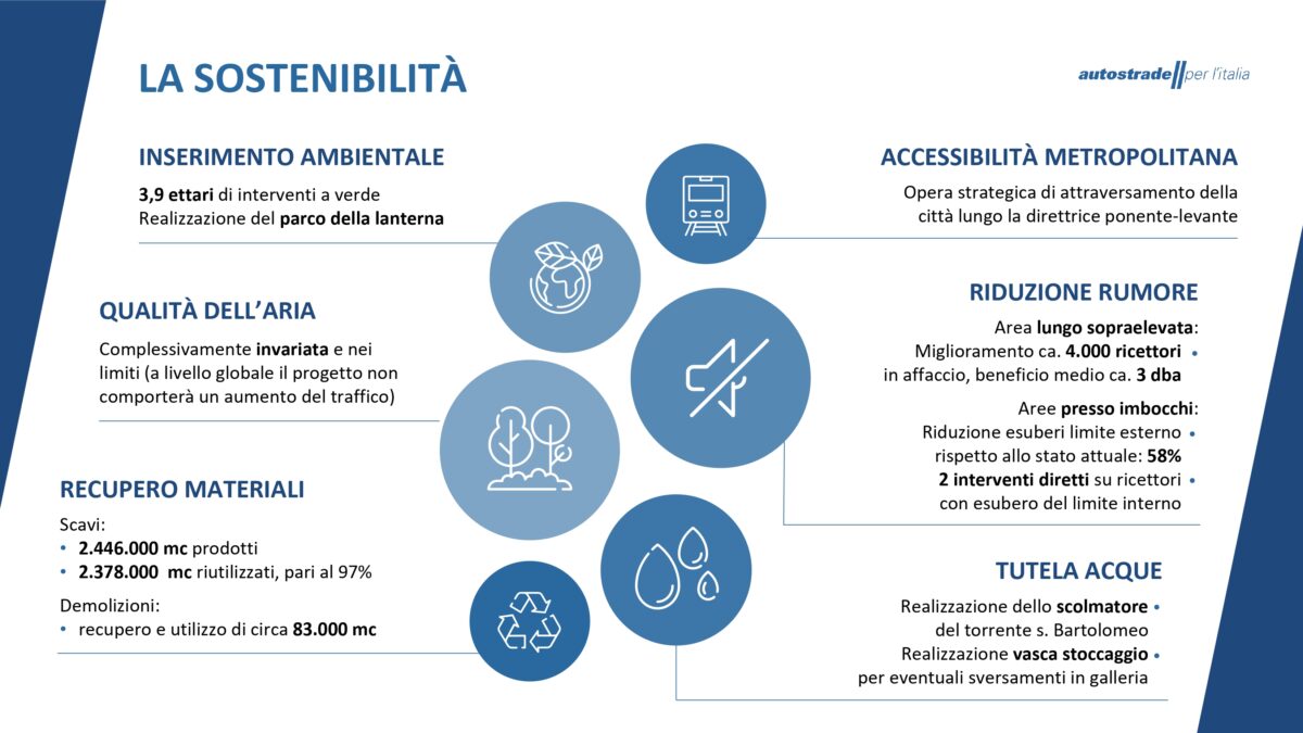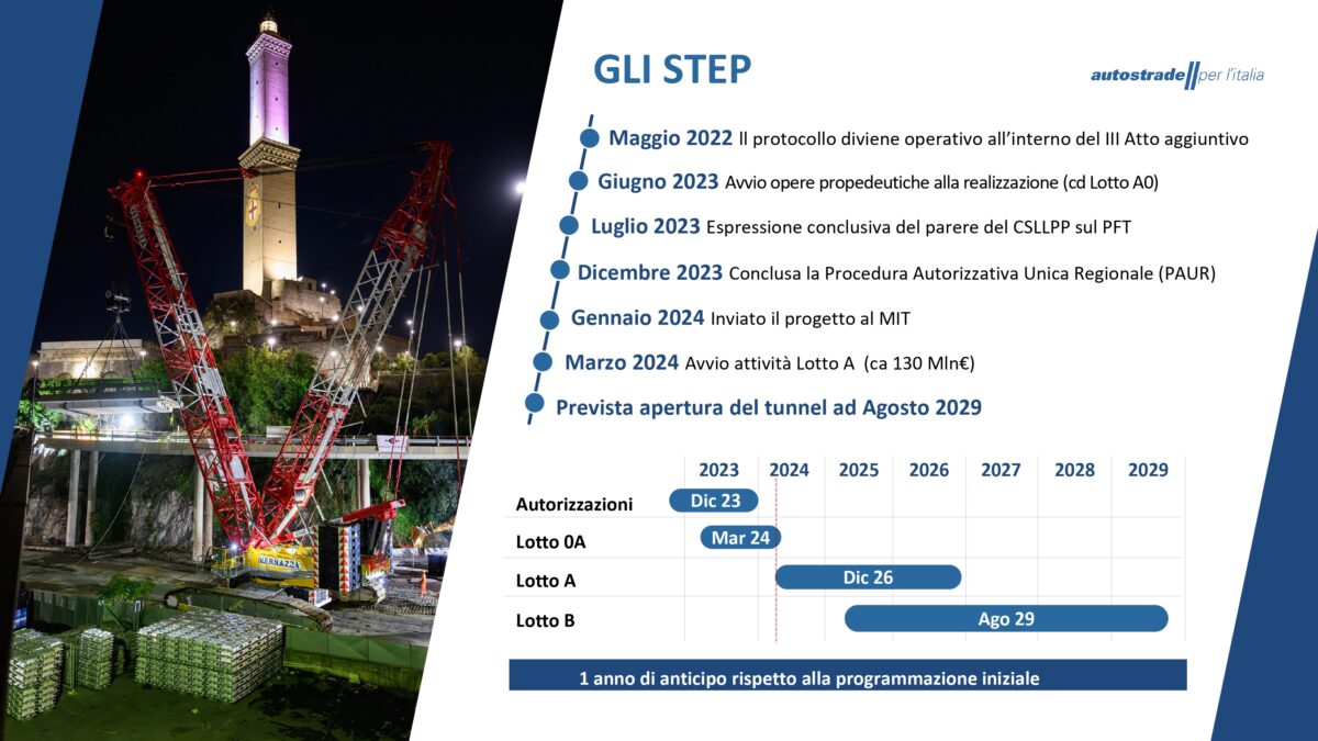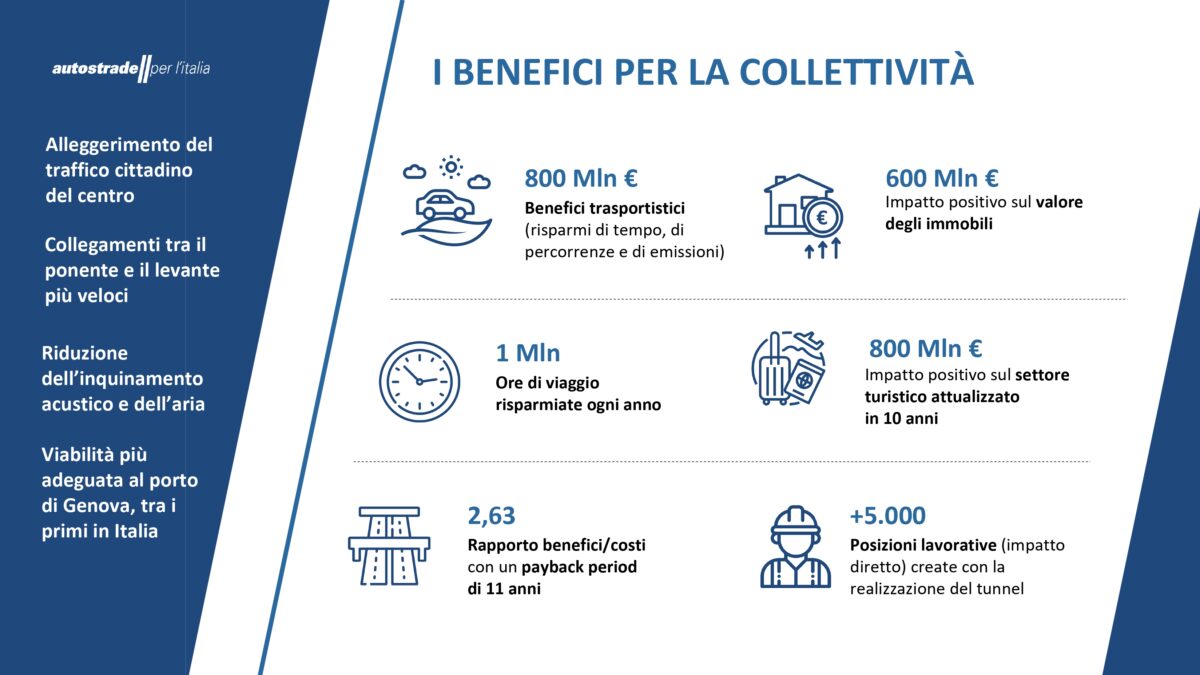 Il tema è centrale anche per il tunnel, dal 2021 inserito, in luogo della gratuità dei pedaggi sulla rete genovese fino al 2031, fra le opere risarcitorie del Morandi in capo ad Autostrade per l’Italia, con la condizione però che quest’ultima potrà ribaltare sulla tariffa nazionale ogni euro eccedente i 700 milioni di euro di costo originariamente preventivato. Aspi infatti ha chiarito che il costo potrà essere contenuto entro il miliardo di euro solo se il nuovo Piano regolatore portuale consentirà di utilizzare per la realizzazione di opere portuali tutto o quasi lo smarino prodotto (Aspi è convinta di poterne recuperare il 97% di 2,5 milioni di metri cubi).