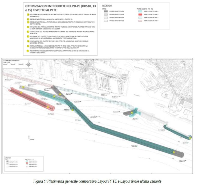 Le modifiche del layout rispetto al progetto preliminare sono ben sintetizzate dall’immagine di seguito e comprendono anche quanto già anticipato da SHIPPING ITALY in merito a revisione di posizione e lunghezza del pennello cosiddetto T5 e all’accorciamento del ramo di levante, col taglio di 4 cassoni.