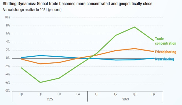 Un fenomeno che però ora sembra aver vissuto una inversione di marcia. Guardando all’ultimo trimestre del 2023, è infatti evidente come il friendshoring sia lievemente calato e parallelamente sia scesa più bruscamente la tendenza alla concentrazione delle relazioni di scambio e alla riduzione dei partner. Allo stesso tempo, il nearshoring vive un leggero aumento.